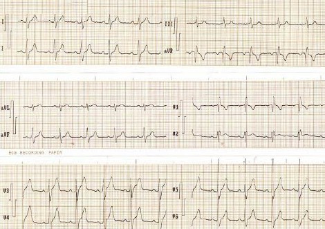 Figura # 1. Electrocardiograma (ECG) de 12 derivaciones de un paciente masculino, joven y aparentemente sano con bloqueo incompleto de rama derecha hisiana. Obsérvese en las derivaciones precordiales derechas el patrón rSR´ con una duración de aproximadamente 0.11 segundos. Presenta además onda T oponente en V1 y signos de repolarización precoz.