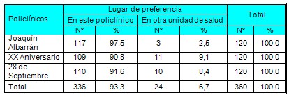 Tabla 16: Distribución de usuarios según lugar de preferencia para su atención por policlínicos seleccionados. 2007