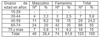 En relación con la edad, el mayor grupo de pacientes se encontró entre los 60 y 74 años, con un total de 66 personas para un 55 %, seguido del grupo de 45 a 59 años, con 29 pacientes(24,2%)y del grupo de 75 y mas años con 18 pacientes(15%).(tabla1) Estos se asemejan a los obtenidos por la AHA, en los que predominó el sexo femenino con 68,3% entre los pacientes estudiados, con mayor cantidad de pacientes entre las edades de 60 a 75 años (7).