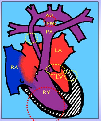 - Se mantiene por: ventrículo derecho (no preparado para altas presiones) y ductus arterioso persistente.