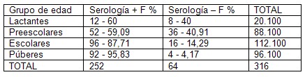 En la Tabla # 5 se muestra como la serología positiva (Ig M e Ig G) antidengue fue mayor en los Púberes con 95,09% y negativa en 4,17%, menor que los otros. Luego los Escolares con 87,71%; los Lactantes con 60% y los Preescolares con 59,09%, entre estos dos grupos la diferencia es menor, podríamos decir que la presencia de anticuerpos positivos es mayor a medida que aumenta la edad.