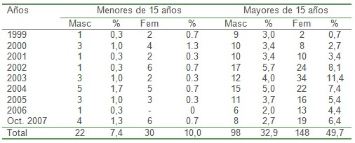En la tabla 1 se muestra la distribución de taeniosis según años, siendo los años donde mayor número de casos se reportaron 2002, 2003 y 2004, para un total de 298, con una tasa de incidencia de 4.1, resultados similares obtuvieron en investigaciones Suarez Hernández y Cruz Licea; en los años sucesivos se aprecia una ligera disminución de los mismos posiblemente relacionada con el incremento de las acciones de educación sanitaria realizadas por el personal de salud con la población en general.