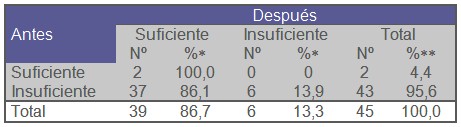 Cuando analizamos los conocimientos de los adolescentes sobre los síntomas y signos de las infecciones de transmisión sexual (Cuadro IV) nos damos cuenta que antes del inicio de la intervención el 4,4% (2 adolescentes) tenían un conocimiento suficiente, mas una vez concluida la misma el 86,7% (39 adolescentes) logra alcanzar dicha categoría, puesto que el 86,1% de los que estaban insuficientes modifican sus conocimientos a suficientes; lo cual es considerado significativo (p < 0,01) desde el punto de vista estadístico.
