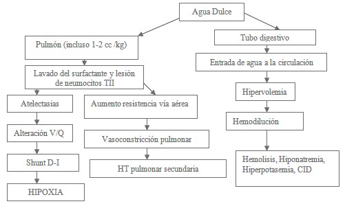 Agua salada: La hipertonicidad del líquido aspirado trae como consecuencia pérdida del surfactante, entrada del agua en los alveolos y edema pulmonar secundario; además de que en el tracto gastrointestinal se produce entrada de agua a la luz intestinal procedente del espacio intersticial con hipovolemia resultante, así como desestructuración de la barrera intestinal y riesgo de sepsis secundaria. EFECTOS: Hipovolemia, shock, hipoproteinemia, hipernatremia, hemoconcentración.
