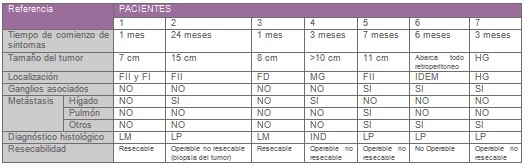 En la tabla # 4 se resume el comportamiento de los pacientes con respecto a los tratamientos y resultados histológicos. El tiempo que medió entre el inicio de los síntomas y el tratamiento fue variable siendo la media de 6.4 meses es importante disminuirlo al máximo para poder tratar a los pacientes en estadios iniciales de la enfermedad. El tamaño de los tumores osciló entre los 7 y 11cm siendo en el paciente # 6 imposible de cuantificar por su gran extensión. En 3 pacientes el tumor se ubicó en el flanco izquierdo.