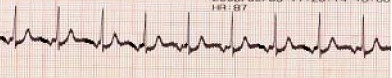 En la figura mostramos un ritmo acelerado de la unión. Note las ondas P negativas delante de los complejos ventriculares y la frecuencia cardiaca de 90 latidos por minuto aproximadamente.