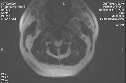 Se realizó estudio de Imágenes por Resonancia Magnética de columna cervical, utilizando un equipo Philips Panorama, abierto, de 0.23 T, realizando secuencias sagitales en T1 y T2 y axiales en B-FFE 3D, donde se observan signos de espondilosis y degeneración discal, complejo disco osteofito a nivel de los espacios intervertebrales C3-C4, hasta C5-C6. Se observa una imagen ocupativa intramedular que provoca ensanchamiento fusiforme de la médula, ocupando la mayor parte del diámetro de la misma y extendiéndose por varios segmentos medulares (desde C3 hasta el espacio intervertebral C6-C7), la cual se muestra hipointensa en T1 e hiperintensa en T2 sin calcificaciones ni otras alteraciones en la intensidad de señales, estando en relación por sus características con un TU (astrocitoma).