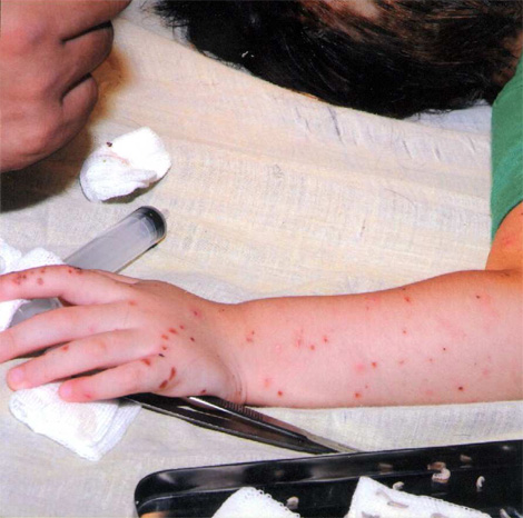 Fig. 4. Estadio de las lesiones luego del tratamiento realizado. Se procedió al rasurado de la paciente, y colocación de xilocaína en jalea con la colocación de la paciente en decúbito para lograr la recolección de las larvas, se colocaron en un frasco para su posterior evolución. Se internó a la paciente para observación y seguimiento del cuadro. Se realizo la antibióticoterapia, con amoxicilina más sulbactam de acuerdo a la edad y peso de la paciente. A las 24 horas se colocó en las lesiones éter y se procedió a la extracción de las larvas que aun continuaban en la lesión. Se mandaron a analizar las larvas obtenidas en el laboratorio se determinó, que el material extraído de la herida del paciente se correspondía con Cochliomyia hominivorax. El cuadro fue resuelto provocando la salida de las larvas y posterior extracción de las mismas, desinfectando la lesión, y con el uso de antibiótico.