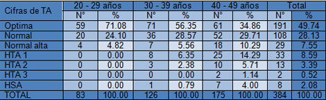 Las mayores de 39 años en este estudio presentaron las cifras más elevadas de tensión arterial, con un 40% de prehipertensas y un 25.14% de hipertensas. Nótese además que en las menores de 30 años no existieron casos de hipertensión arterial (HTA). Nuestros hallazgos refuerzan la teoría protectora del influjo estrogénico, observándose en el grupo de 40 a 49 años los primeros indicios del proceso climaterio- menopausia, lo que explicaría la mayor incidencia de cifras tensionales no óptimas. Estos resultados pueden ser valorados en la Tabla # 2.
