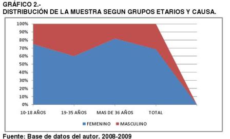 La distribución etérea más frecuente fue entre los 19 y 35 años según se representa en el gráfico 2. Mientras hubo predominio del sexo femenino en los casos con dolor abdominal por un lado, por el otro predominó el sexo masculino en los casos con trauma. Estos resultados coinciden con los reportes de algunos autores (12 - 14).