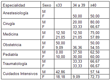 Los resultados obtenidos en términos porcentuales de agotamiento emocional en las diferentes especialidades (ver tabla 6) indican que los residentes de cirugía se ubicaron en el nivel más alto. 83,33 por ciento (sexo femenino), seguidos de medicina, también el nivel medio cirugía mostró los valores más elevados con un 60 por ciento (sexo masculino), seguido de obstetricia y medicina interna con un 54,55 y 52,65 por ciento respectivamente (sexo femenino). Los niveles más bajos de agotamiento emocional se obtuvieron en los residentes de cuidados intensivos. El distanciamiento emocional en el nivel alto, se observó en los residentes de cirugía con 50 y 40 por ciento para ambos sexos. (Tabla 7).