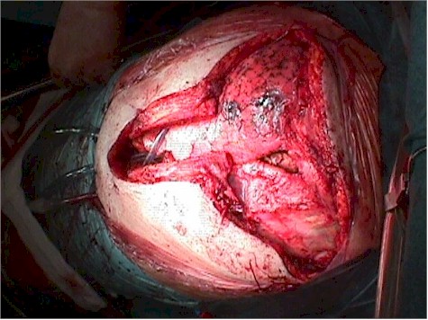 8. Aspecto del tórax, una vez reinstaurada la circulación nativa. Llama la atención el aumento de tamaño del pulmón izquierdo, que casi ocupa todo el hemitórax de ese lado, a pesar de haber permanecido rechazado hacia la base durante años.