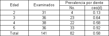 Ø La prevalencia de caries dental en niños institucionalizados de 2 a 5 años de edad es baja respecto a la encontrada en el país, siendo mayor en los niños de 5 años de edad.