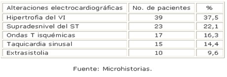 En la tabla 4 se analiza el comportamiento de las alteraciones electrocardiográficas que más frecuentemente presentaron los pacientes, y se refleja que 39 pacientes desarrollaron una hipertrofia del ventrículo izquierdo (VI) (37,5%), y en segundo lugar se encontró el supradesnivel del ST, que se presentó en 23 pacientes para un 22,1%.