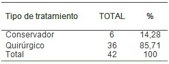 En la tabla 6 se puede observar el tipo de tratamiento que se realizó a los 42 pacientes atendidos con fractura de cadera, donde predominó el quirúrgico en 36 de ellos con un 85,71%, y solamente el tratamiento conservador se realizó en 6 para un 14,28%.