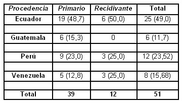 De los 51 pacientes evaluados, el 49% (25/51) procedían del Ecuador, 23% (12/51) de Perú, 15% (8/51) fueron venezolanos y 11% (6/51) de Guatemala. 60.7% fueron masculino y 39.2% femenino. El tipo de pterigium que se observó con mayor frecuencia fue el primario 76,6% (39/51) mientras que el recidivante se presento en un 23,5% (12/51). La distribución de los casos de pterigium según su procedencia y grado de biometría se presenta en la Tabla 1.