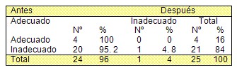 En el cuadro 2, correspondiente al conocimiento de las generalidades del aparato masticatorio podemos observar, que de un total de 25 pacientes, antes de la intervención, 16 para un 64% tuvieron una respuesta inadecuada y 9 pacientes tuvieron respuestas correctas, sin embargo posterior al programa educativo, el 100% de los pacientes contestaron adecuadamente. Resultados similares fueron encontrados por otros autores en sus estudios, los cuales se desarrollaron bajo condiciones similares tales como Mero luz 28, Sánchez 32 quienes hallaron un pobre dominio de las características normales del sistema estomatognático pasando incluso por alto anomalías presentes en las futuras madres y las consideraban como normales.