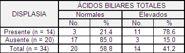 De los 34 restantes, 14 presentaron displasia y de éstos, 11 (78,6%) tuvieron los ácidos biliares totales (ABT) elevados. En los 20 pacientes sin displasia, sólo 3 (15,0%) presentaron los ácidos biliares totales (ABT) elevados y 17 (85,0%), cifras normales de éstos. Se observó diferencia significativa (p<0,01) (tabla 3).
