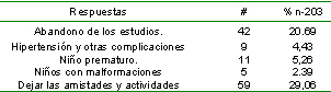 4.- Registramos un conocimiento elevado en las adolescentes con mayor énfasis en la de edades tempranas acerca de los riesgos que implica el aborto, muy superior a la percepción de peligro en relación al embarazo precoz En el primero las respuestas más frecuentes fueron dolores y sangramiento y respecto al segundo dejar las amistades, actividades, seguido de abandono de los estudios