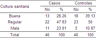 El mayor número de pacientes presento una cultura sanitaria regular en los casos con 22 pacientes para un 47.83%, sin diferencias significativas con los controles. Como se observa en la tabla no se considero la cultura sanitaria como un factor predominante.