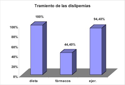 El 28 % presentó dislipemias. En el tratamiento encontramos que el 100 % realiza dieta, el 94.4 % cumple con el ejercicio físico y sólo el 44,4% toma medicación.