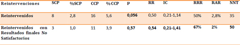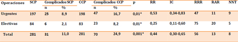 SCP: Pacientes sin cierre peritoneal. %SCP: = número de pacientes con Resultados no Satisfactorios de SCP x 100/281. CCP: Pacientes con cierre peritoneal. %CCP= número de pacientes con Resultados no Satisfactorios de CCP x 100/281. p: nivel significación * Diferencias estadísticamente significativas, si la diferencia entre los grupos es mayor que el error estándar x 1,96. RR: Riesgo Relativo. IC: intervalo de confianza de RR para 0,95 Percentil. RRR: Reducción Relativa del Riesgo. RAR: Reducción Absoluta del Riesgo. NNT: Número Necesario de Pacientes a Tratar.