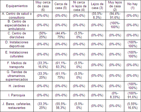 En ambos sexos coinciden que tanto el centro de salud como el centro de especialidades están lejos o muy lejos. En cuanto a instalaciones deportivas, culturales, jardines y parroquia no existen en el pueblo y que el club de la tercera edad, transporte, supermercado y bares están cerca o muy cerca de su casa.