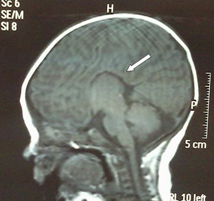 Figura 3. Caso 3: Agenesia completa del cuerpo calloso. Técnica RM, proyección sagital medial cerebral con secuencia de pulso SE-T1. Ausencia del cuerpo calloso (flecha banca) y comisura anterior.