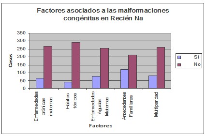 En nuestro estudio hemos comprobado las infecciones agudas en la madre aparecen en el 23.0% de las madres de los casos afectados. Los hábitos tóxicos en la madre durante el embarazo, están presentes en el 12.2% de pacientes afectados, encabezados por el hábito de fumar en el primer trimestre de la gestación. Importante papel tienen los antecedentes genéticos familiares en la aparición de malformaciones congénitas, donde el 35.9% de los nacidos con estas patologías tenían el antecedente. En nuestro estudio hemos encontrado una asociación de hasta un 24.8% de las madres multíparas y la aparición de defectos en los hijos.