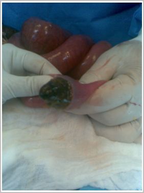 Se realiza enterotomía para extracción del mismo, con posterior enterorrafia en 2 planos con crómico 2-0 y seda 2-0 (figuras 4, 5 y 6). Se explora el área vesicular evidenciando la misma, emplastronada y en comunicación con el duodeno.