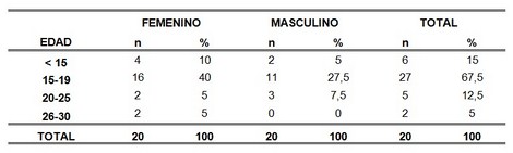 En la tabla 1, donde se expone la eficacia terapéutica de los peloides en el acné vulgar según la edad y el sexo, se confirmó un predominio del sexo femenino con 24 mujeres para un 60% y una mayor proporción en el grupo de edades de 15-19 años con 27 personas para un 67,5%, a partir del cual disminuye el porcentaje a medida que aumenta la edad, sobre todo en el sexo masculino.