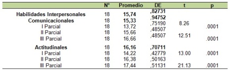 En lo que respecta al logro de las habilidades interpersonales se observó que tomando un nivel de confianza del 95% (α = .05) hubo diferencia significativa en las habilidades interpersonales, con un nivel de significancia de p = .0001. A partir de este resultado se afirmó que el uso del portafolio influyó significativamente en el logro de habilidades interpersonales de los estudiantes que cursaron la asignatura Enfermería Básica.