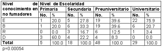 La distribución de personas no fumadoras según niveles de escolaridad y conocimiento se expone en la tabla No.6, donde se observa que para los niveles de escolaridad de secundaria en adelante existió un nivel de conocimiento entre excelente y bueno, no así en la primaria donde el 60% de las personas tuvieron un nivel de conocimiento deficiente. Al aplicar la prueba de hipótesis chi-cuadrado se aprecia que existe asociación estadísticamente significativa entre ambas variables (p=0.00054).