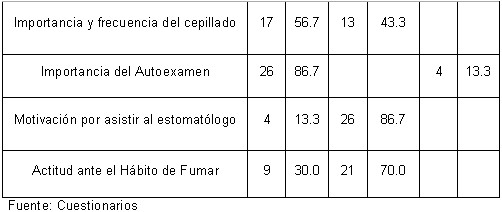 Por la importancia que para nosotros han tenido estas variables investigadas, ya sea por su utilidad a la hora de diseñar la estrategia educativa como por el hecho de que constituyen las principales áreas del conocimiento sobre salud bucal que deberían dominar nuestros pacientes por su condición de seropositivos, creemos necesario el análisis individual de los resultados obtenidos en cada una de ellas; de esta forma podemos mencionar la relación que tienen con el estado de salud bucal y general del paciente VIH/SIDA.