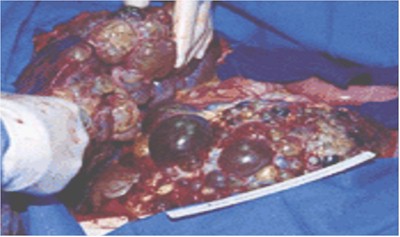 Mostramos el caso de una mujer de 45 años de edad con PQRAD con clínica urológica para consideración de nefrectomía bilateral por severo dolor y distensión abdominal (fig. 16). La RMN del abdomen (panel A) mostró un gran agrandamiento y reemplazo completo del hígado (flecha de arriba) y de los riñones (flecha de abajo) por quistes. Se realizó nefrectomía bilateral (panel B), con remoción del riñón izquierdo que midió 29 cm. por 20 cm. por 14 cm. (peso 3.100 g) y el riñón derecho midió 28 cm. por 14 cm. x 11 cm. (peso 1.600 g). Los riñones contenían quistes con 5 cm. de diámetro de tamaño. La paciente notó una inmediata mejoría en el dolor abdominal y una marcada disminución de la distensión abdominal.   Figura 16. Panel A: Tomografía axial computada. Panel B: Nefrectomía bilateral.