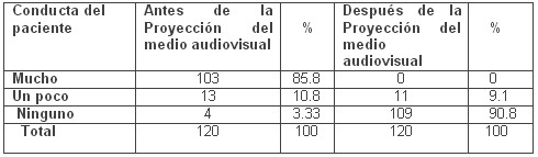 De acuerdo al nivel de temor, ansiedad y miedo la conducta que presentaron los 120 pacientes antes de ser proyectado el material audiovisual fue en 103 de mucho, representando el 85.8%, se observo en 13 un poco para un 10.8% y en 4 ninguno; después de la proyección del medio audiovisual el nivel de temor, ansiedad y miedo refieren 11 pacientes que es un poco para 9.1% y no presentan ningún temor 109 pacientes para un 90.8% (tabla1).