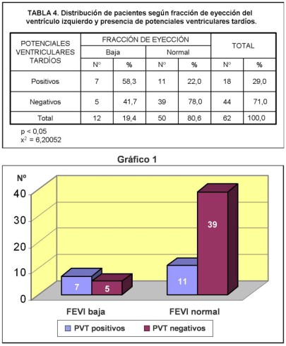 En la tabla 4 y el gráfico 1, se muestra la distribución de los pacientes en relación con su fracción de eyección del ventrículo izquierdo y los potenciales ventriculares tardíos. Obsérvese que en los pacientes con fracción de eyección del ventrículo izquierdo baja fue más frecuente la presencia de potenciales ventriculares tardíos positivos (58,3 %) y en los de fracción de eyección del ventrículo izquierdo normal, la mayoría tuvo potenciales tardíos negativos (78,0 %). Se encuentra entonces una relación estadísticamente significativa (p=0,01277) entre estas variables.