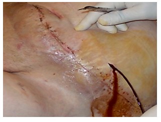 A las 3 semanas de la intervención, se evacuó un hematoma-seroma, que pasó desapercibido al retirar los drenajes y dar alta hospitalaria.