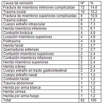 Las lesiones más frecuentemente remitidas fueron las fracturas de miembros inferiores complicadas (14,6%), seguidas de trauma ocular (1,4%), fracturas de miembros superiores complicadas (1,3%) y traumas de cráneo (0,8%). (Tabla 6)